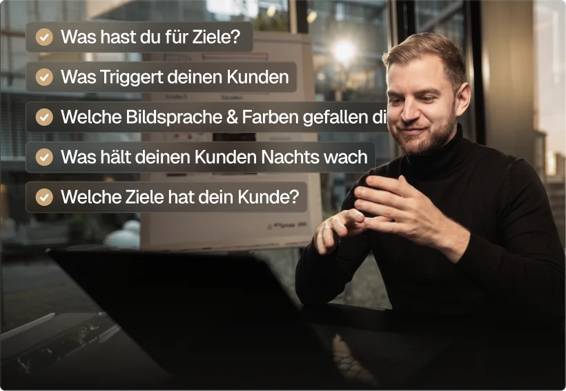 Texte, Design, Bildsprache, Build — ich übernehme alles. Du gibst kurz Feedback, den Rest mach ich.